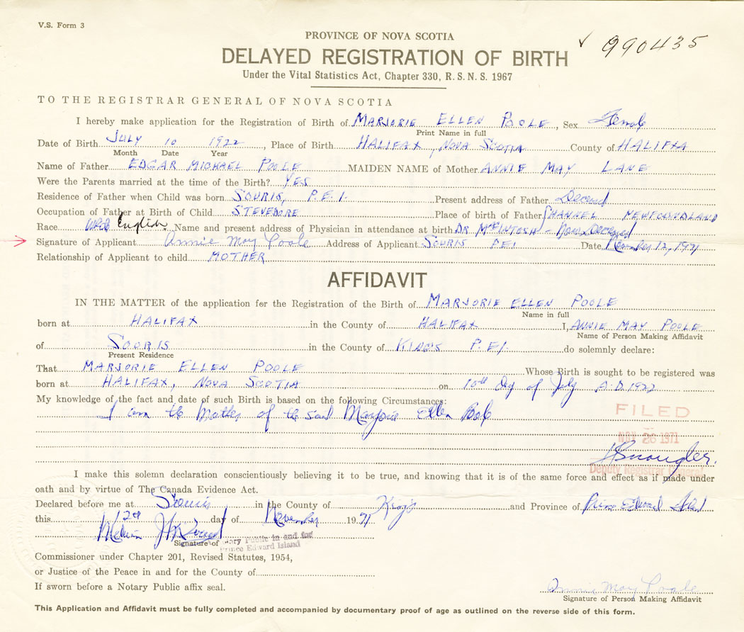 Signature of Applicant Annie May Poole Address of Applicant Souris, Prince Edward Island Date 12 November 1971
