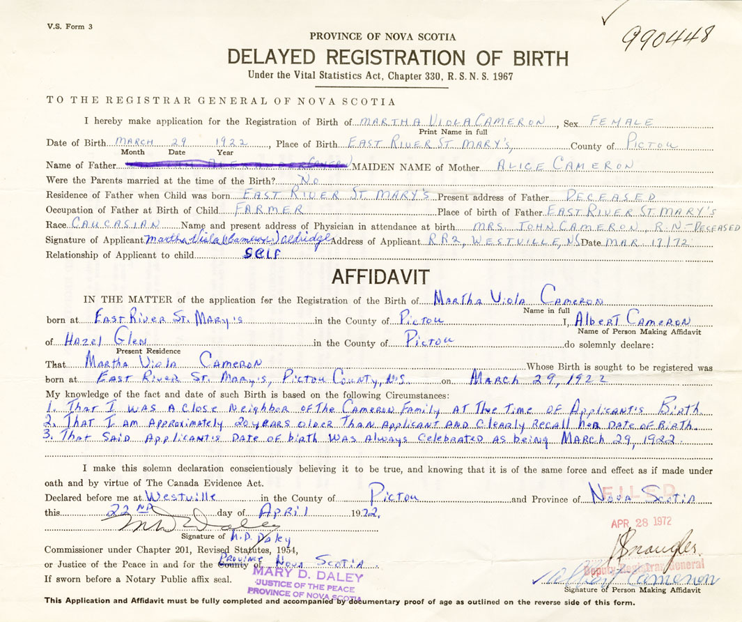 Signature of Applicant Martha Viola Cameron Aldridge Address of Applicant RR #2, Westville, Pictou Date 17 March 1972