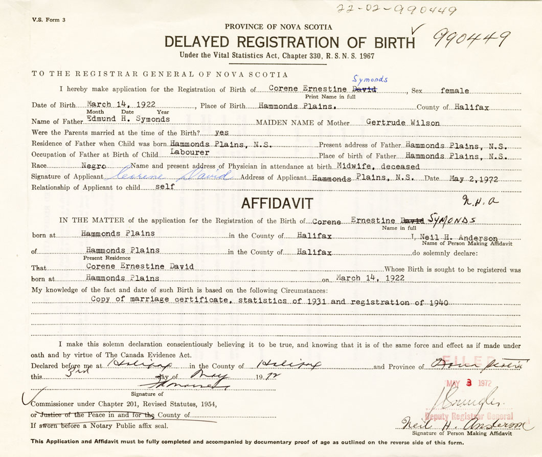 Signature of Applicant Corene David Address of Applicant Hammonds Plains, Halifax Date 2 May 1972