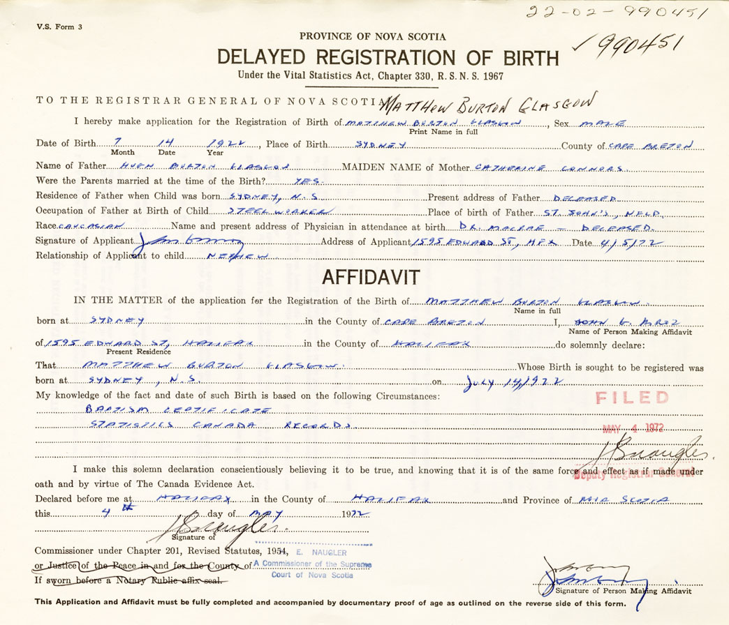IN THE MATTER of the application for the Registration of the Birth of Matthew BurtonGlasgow