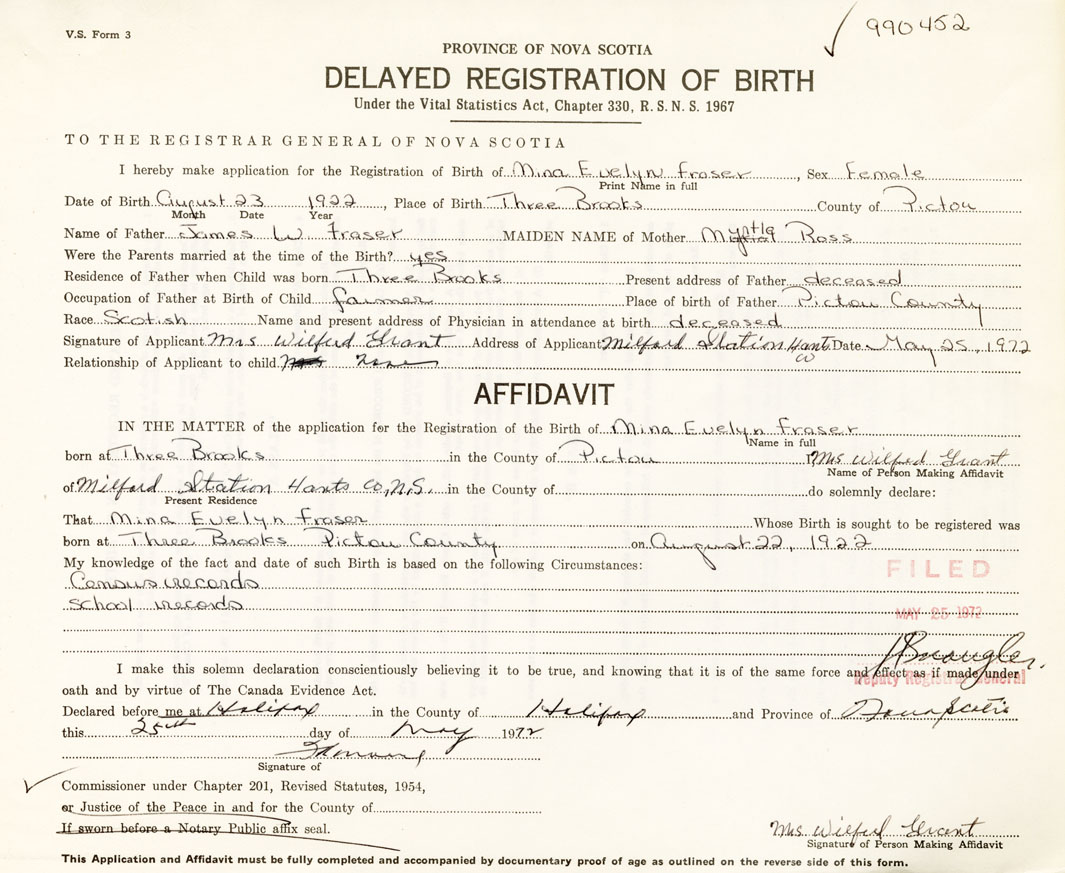 Date of Birth August 23, 1922 Place of Birth Three BrooksCounty of Pictou