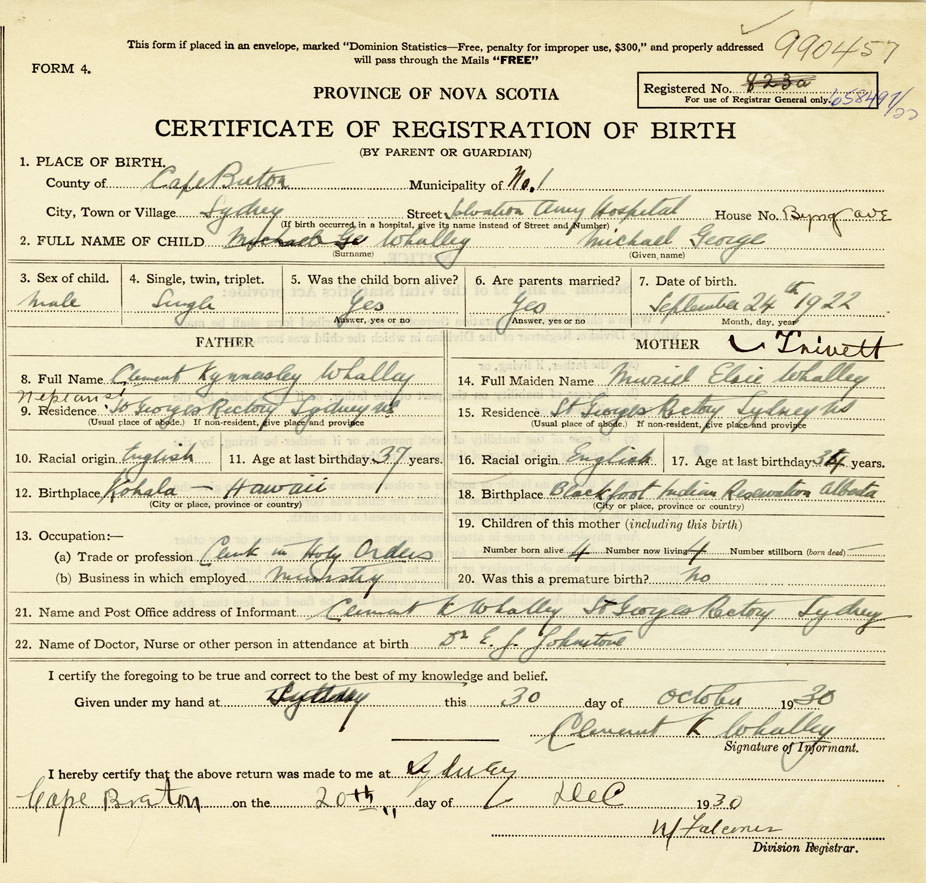 Residence of Father when child was born Sydney, Cape Breton Present address of Father Nepean Street, St. Georges Rectory, Sydney, Cape Breton