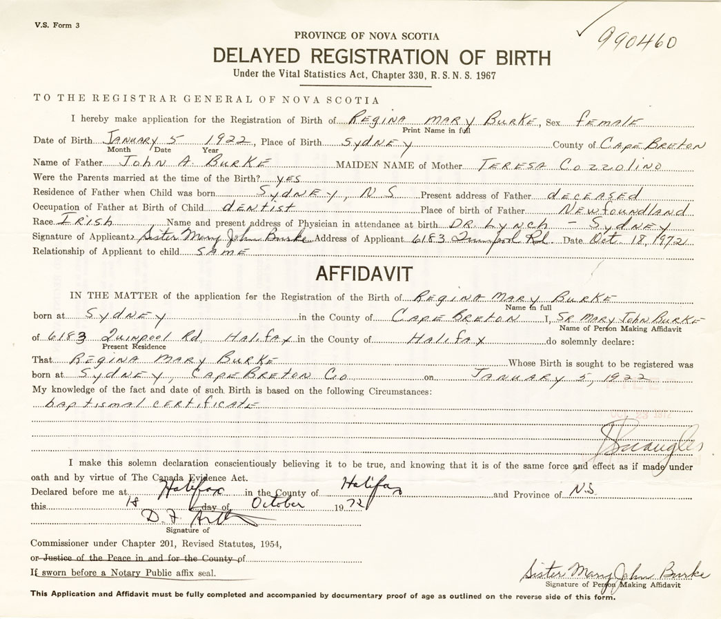 Signature of Applicant Sister Mary John Burke Address of Applicant 6183 Quinpool Road, Halifax Date 18 October 1972