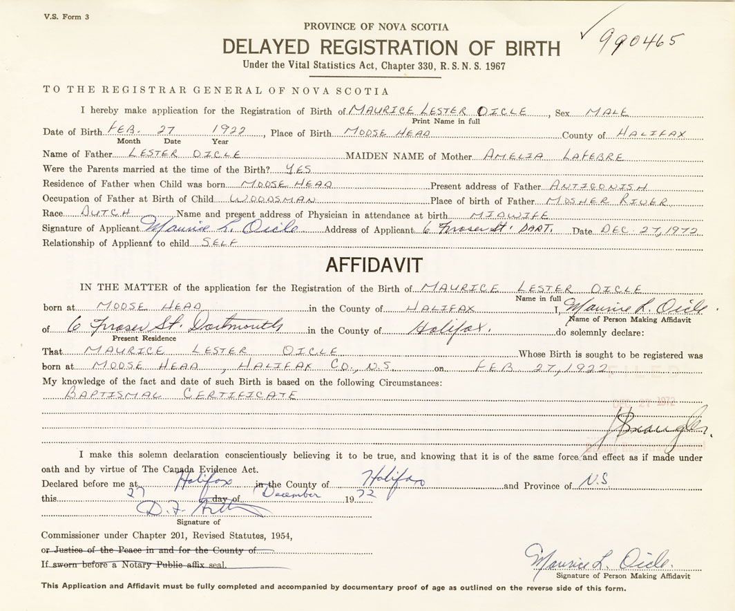 Signature of Applicant Maurice L. Oicle Address of Applicant 6 Fraser Street, Dartmouth Date 27 December 1972