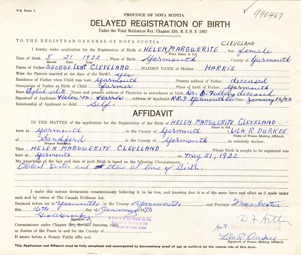 Signature of Applicant Helen M. Harris Address of Applicant RR #3, Yarmouth Date 16 January 1973