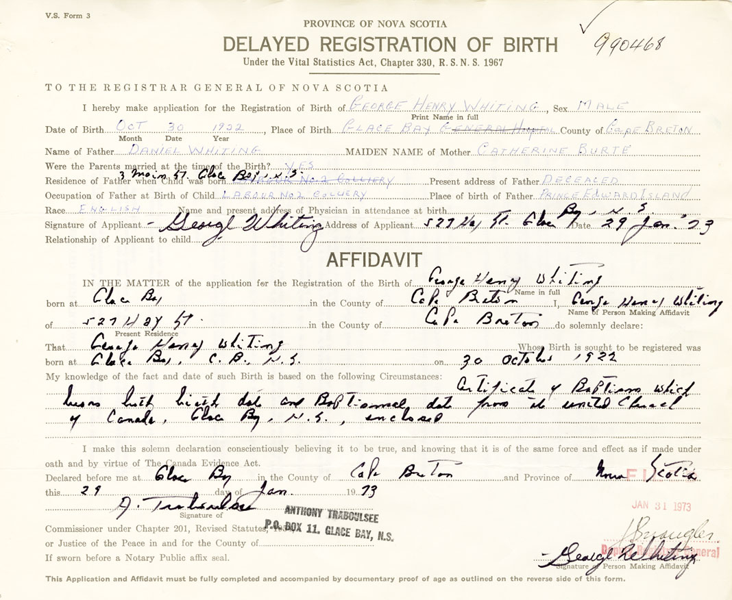 Signature of Applicant George Whiting Address of Applicant Glace Bay, Cape Breton Date 29 January 1923