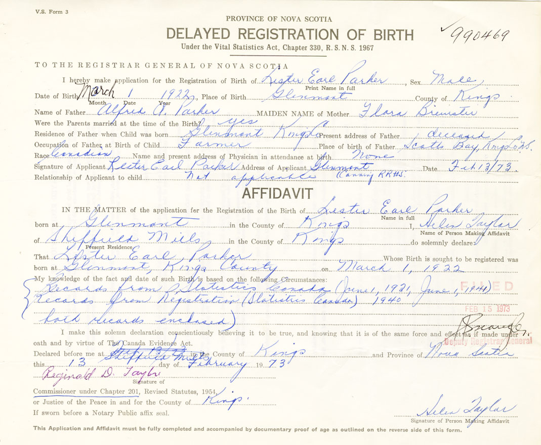 Signature of Applicant Rector Earl Parker Address of Applicant Glenmont, RR #5, Canning, Kings Date 13 February 1973
