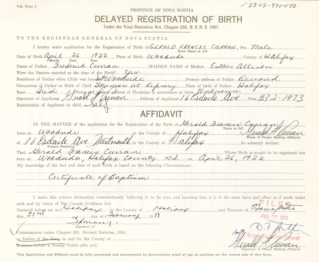 Date of Birth April 26, 1922 Place of Birth WoodsideCounty of Halifax