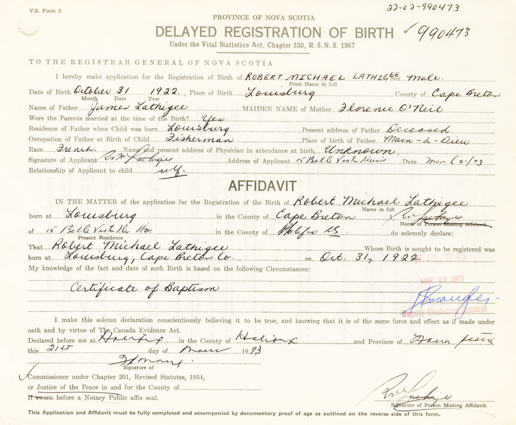 Date of Birth October 31, 1922 Place of Birth LouisburgCounty of Cape Breton
