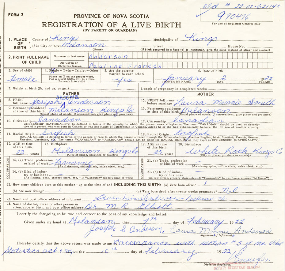 born at Melanson Kings County on January 2, 1922