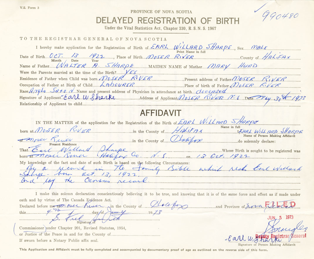 Signature of Applicant Earl W. Sharpe Address of Applicant Moser River, Halifax Date 30 May 1973