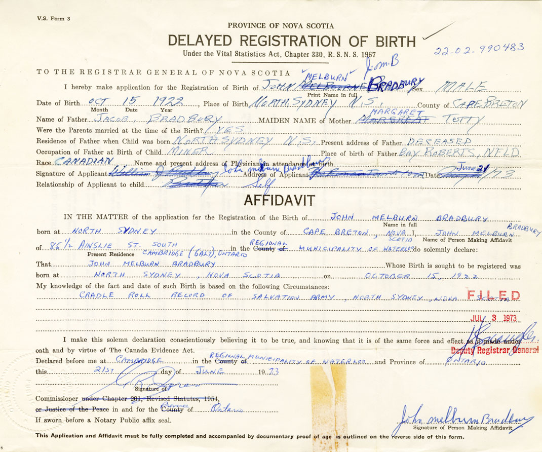 Date of Birth October 15, 1922 Place of Birth North SydneyCounty of Halifax