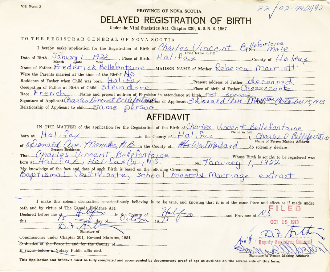 21. Name and Post Office address of Informant Charles Vincent Bellefontaine 3 Donald Avenue, Moncton, New Brunswick