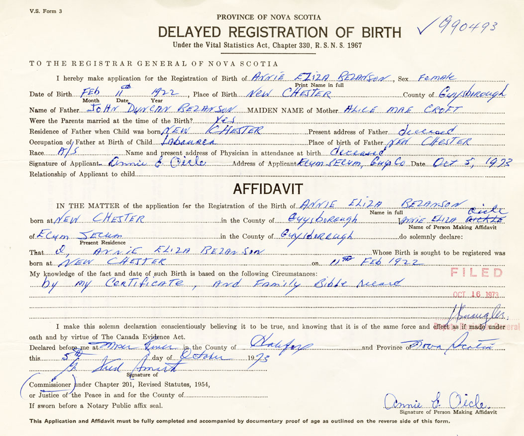 Signature of Applicant Annie E. Oicle Address of Applicant Ecum Secum, Guysborough Date 5 October 1973