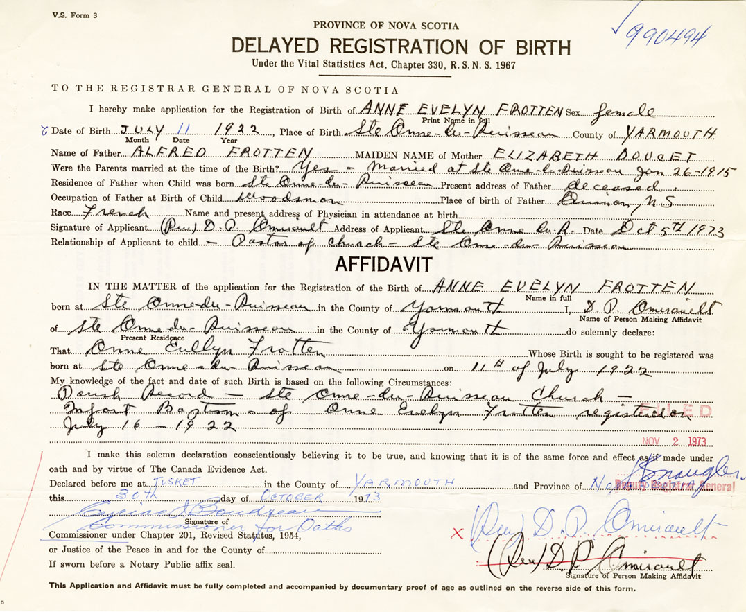 born at Ste. Anne Du Ruisseau Yarmouth County on July 11, 1922