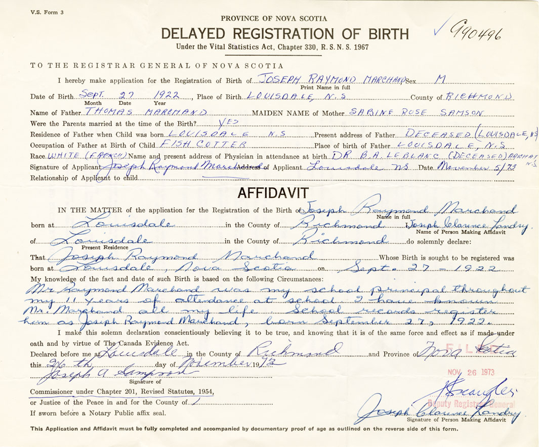 I hereby make application for the Registration of Birth of Joseph RaymondMarchand Sex Male