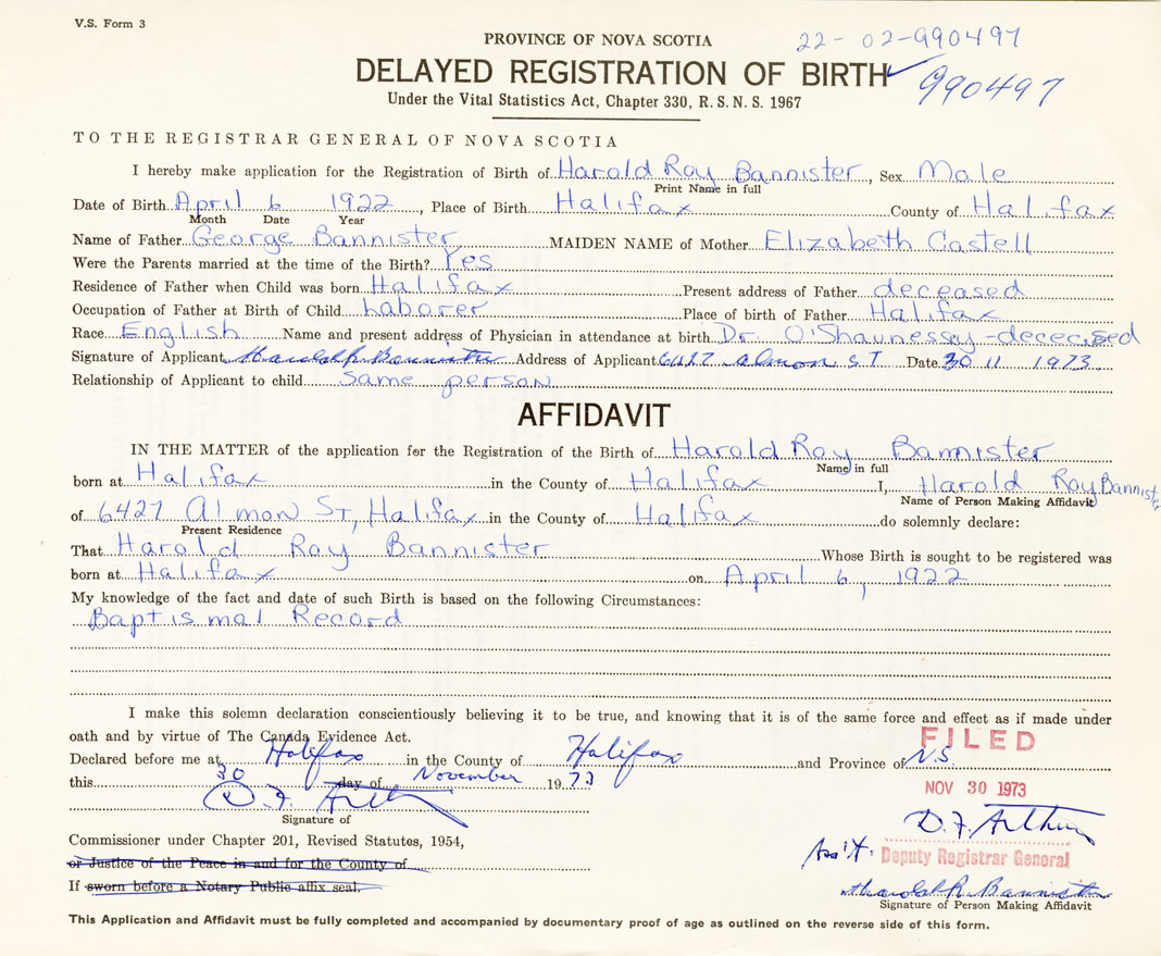 Signature of Applicant Harold Bannister Address of Applicant 6422 Almon Street, Halifax Date 30 November 1973