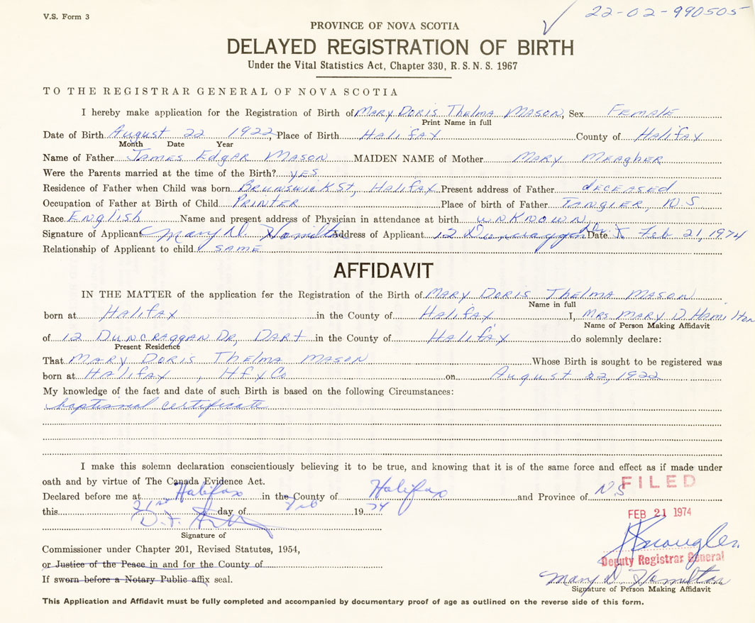 IN THE MATTER of the application for the Registration of the Birth of Mary Doris ThelmaMason