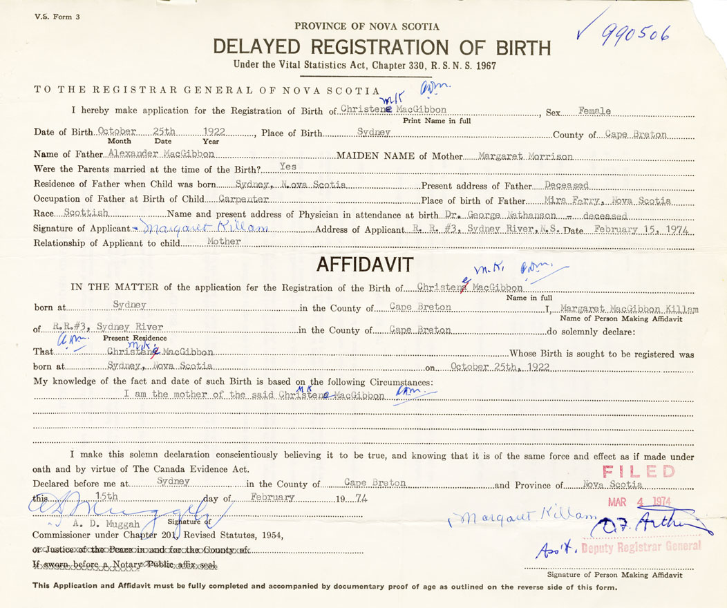 Signature of Applicant Margaret Killam Address of Applicant RR #3, Sydney River, Cape Breton Date 15 February 1974