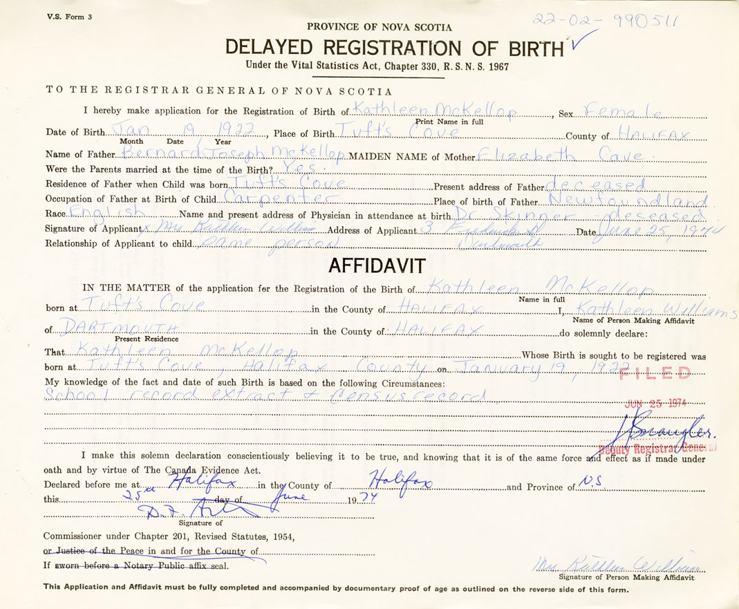 Date of Birth January 19, 1922 Place of Birth Tufts CoveCounty of Halifax