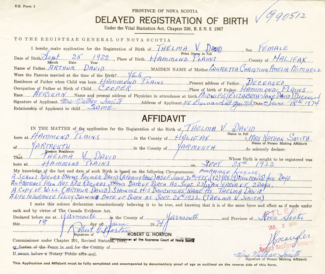 IN THE MATTER of the application for the Registration of the Birth of Thelma VaneeraDavid