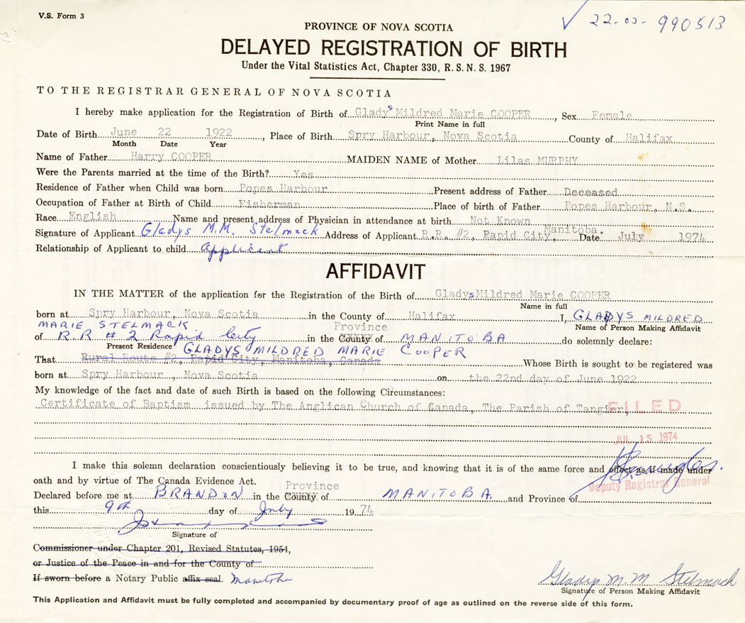 Signature of Applicant Gladys M. M. Stelmack Address of Applicant RR #2, Rapid City, Manitoba Date July 1974