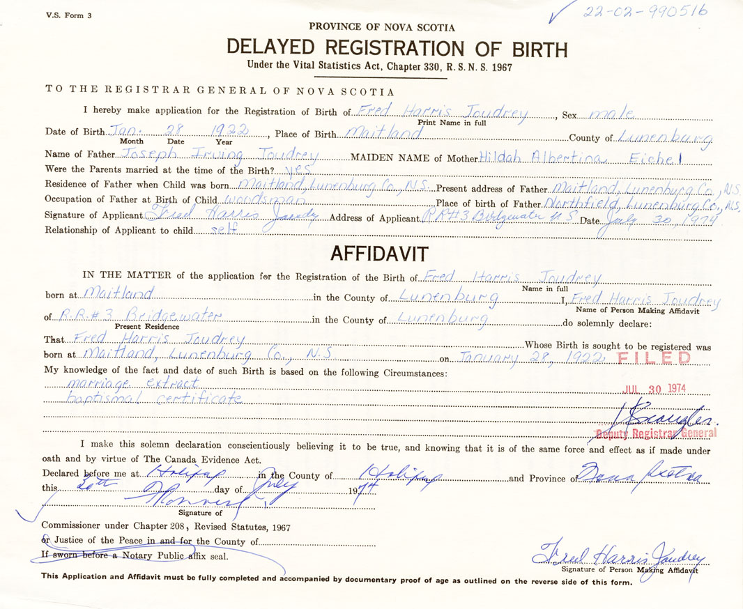 Signature of Applicant Fred Harris Joudrey Address of Applicant RR #3, Bridgewater, Lunenburg Date 30 July 1974