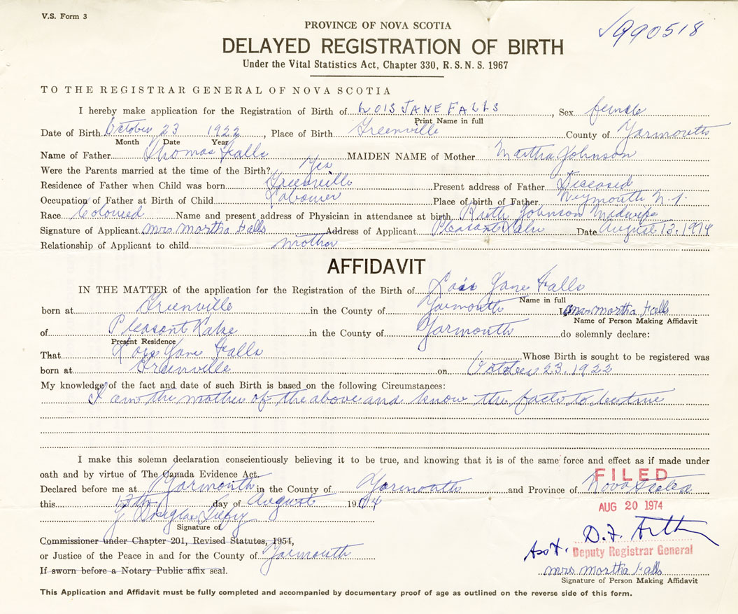 IN THE MATTER of the application for the Registration of the Birth of Lois JaneFalls