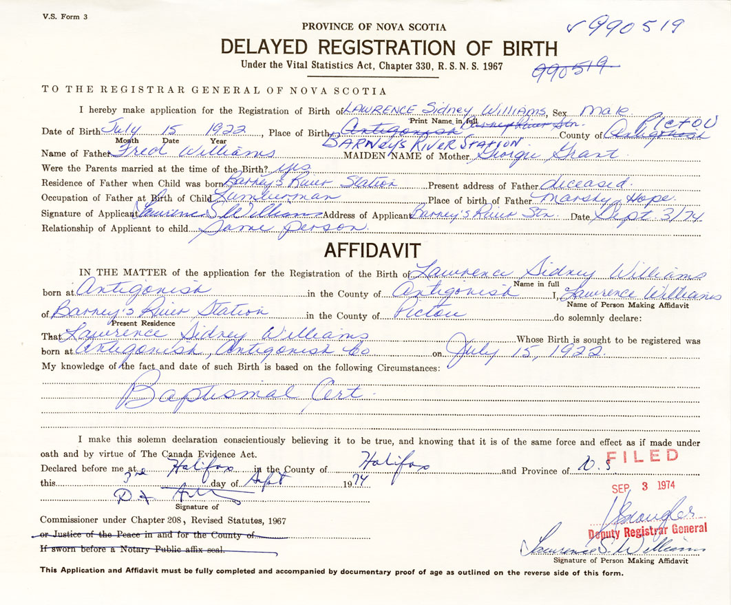 Signature of Applicant Lawrence S. Williams Address of Applicant Barneys River Station, Pictou Date 3 September 1974