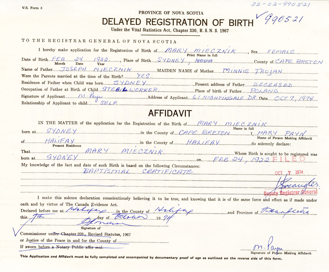 I hereby make application for the Registration of Birth of MaryMiecznik Sex Female