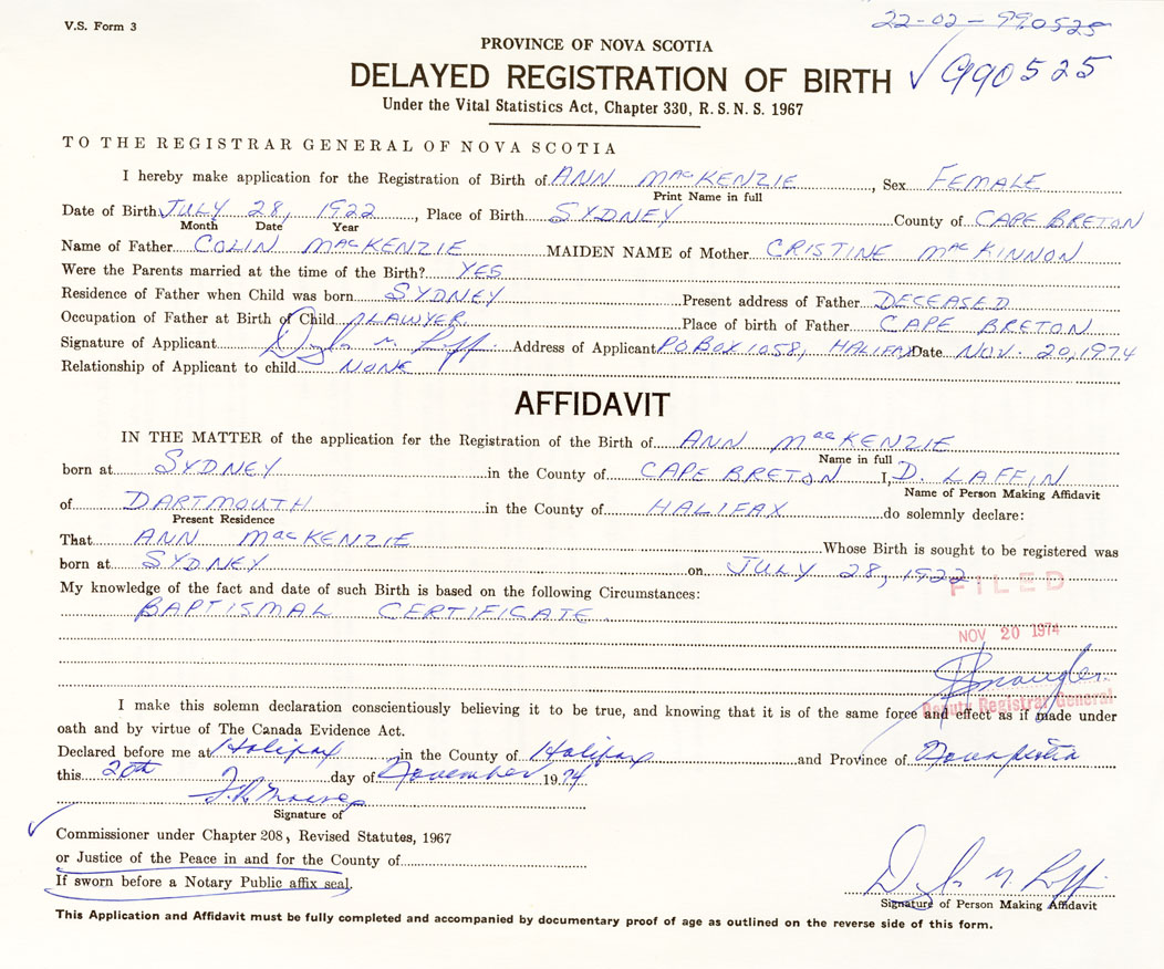Residence of Father when child was born Sydney, Cape Breton Present address of Father Deceased