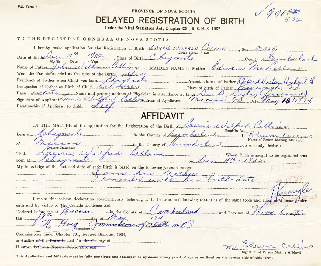 I hereby make application for the Registration of Birth of Laurie WilfredCollins Sex Male
