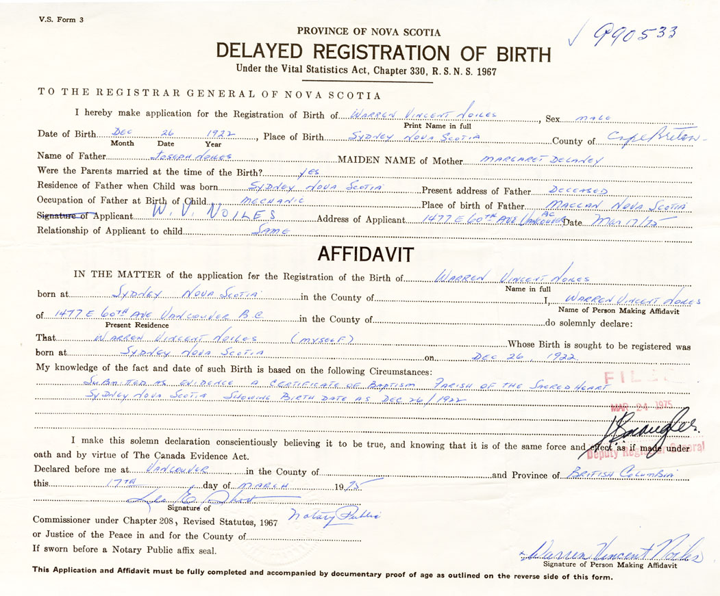 I hereby make application for the Registration of Birth of Warren VincentNoiles Sex Male