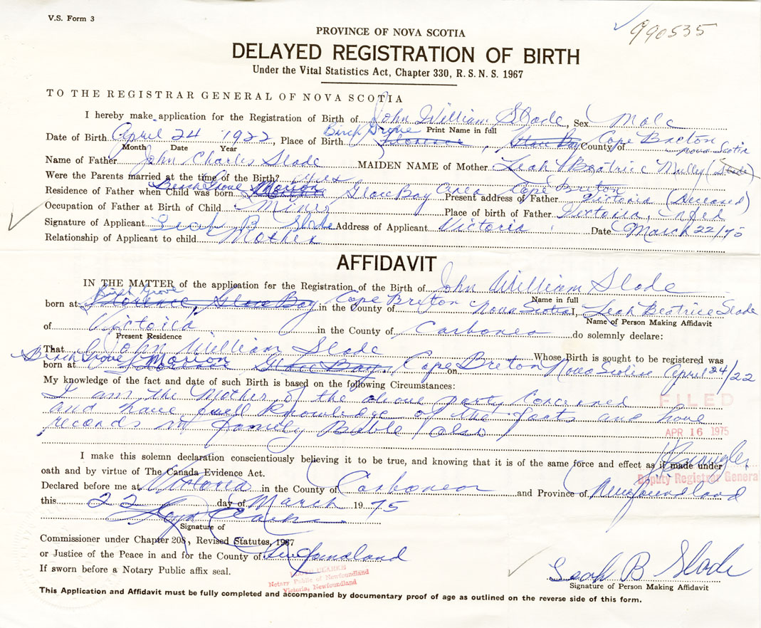 Signature of Applicant Leah B. Slade Address of Applicant Victoria, Cape Breton Date 22 March 1975