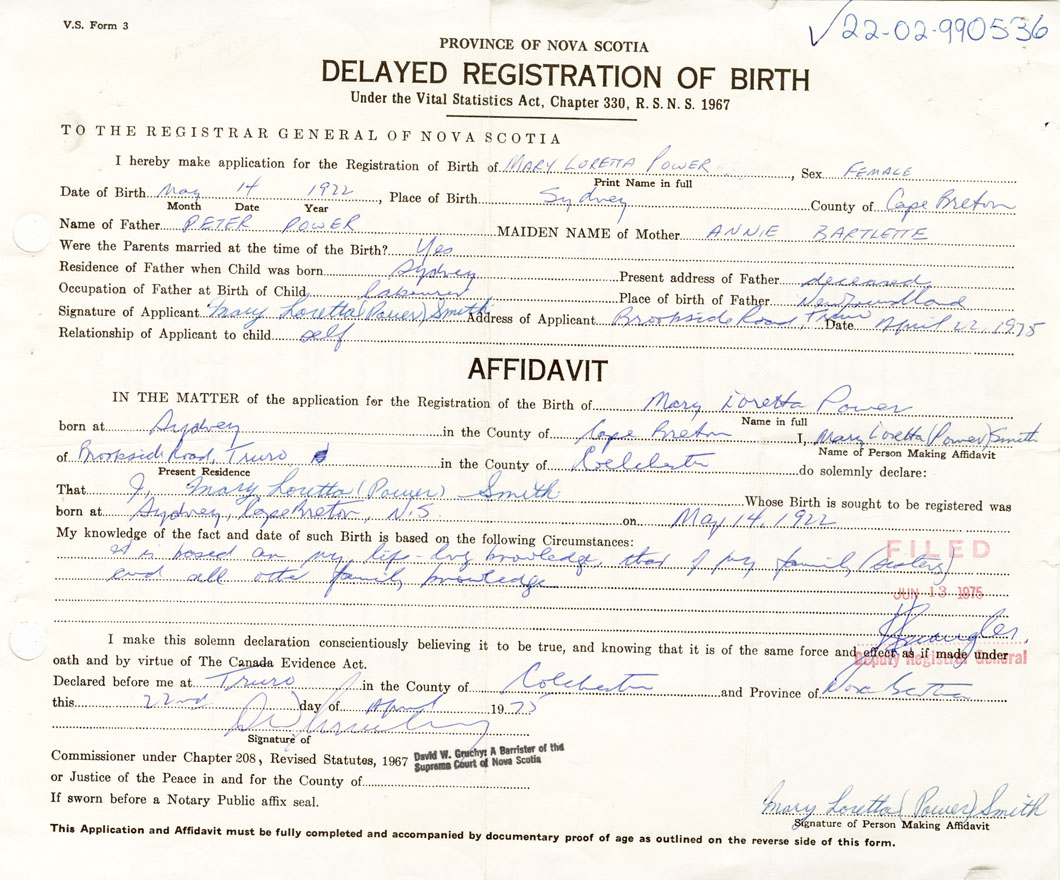 Signature of Applicant Mary Loretta (Power) Smith Address of Applicant Brookside Road, Truro, Colchester Date 22 April 1975