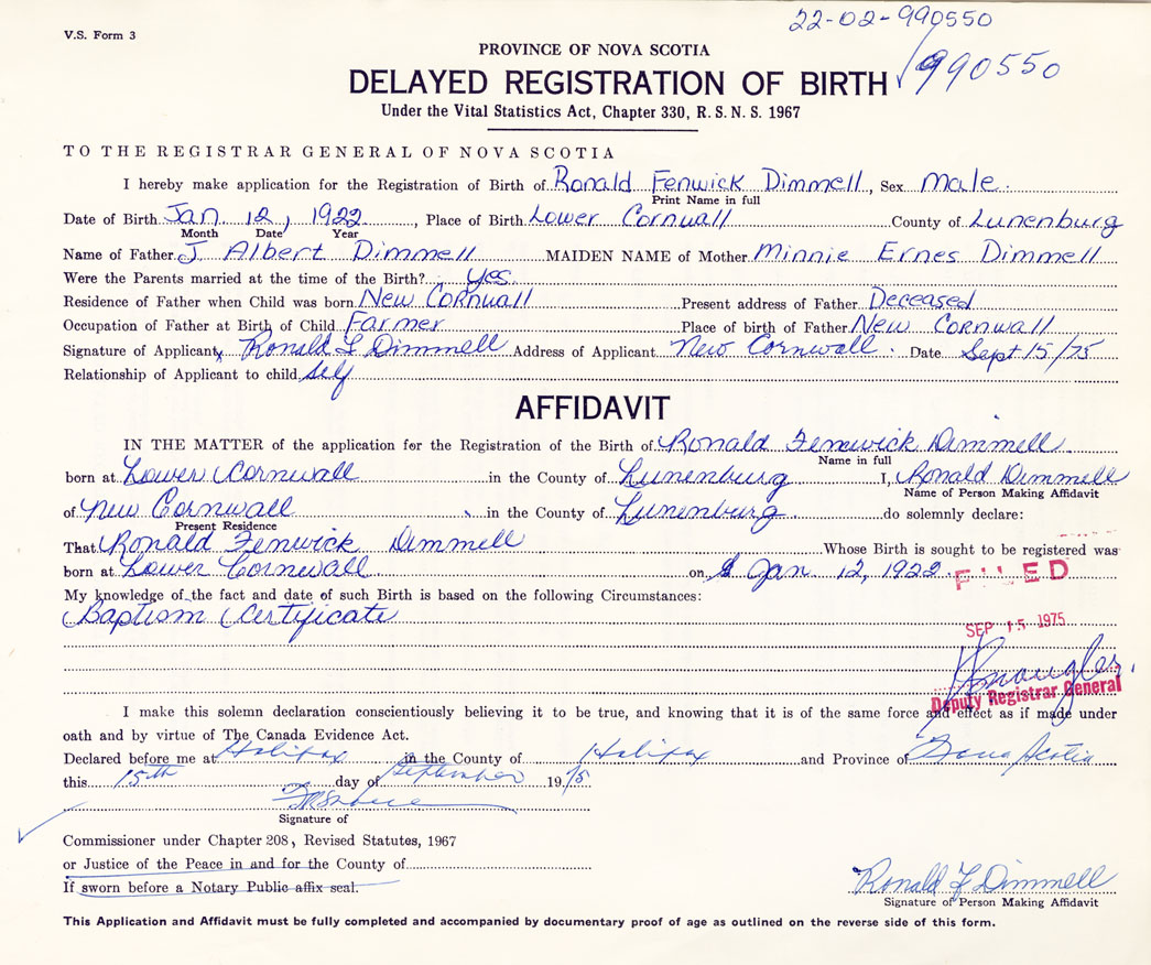 Signature of Applicant Ronald L. Dimmell Address of Applicant New Cornwall, Lunenburg Date 15 September 1975