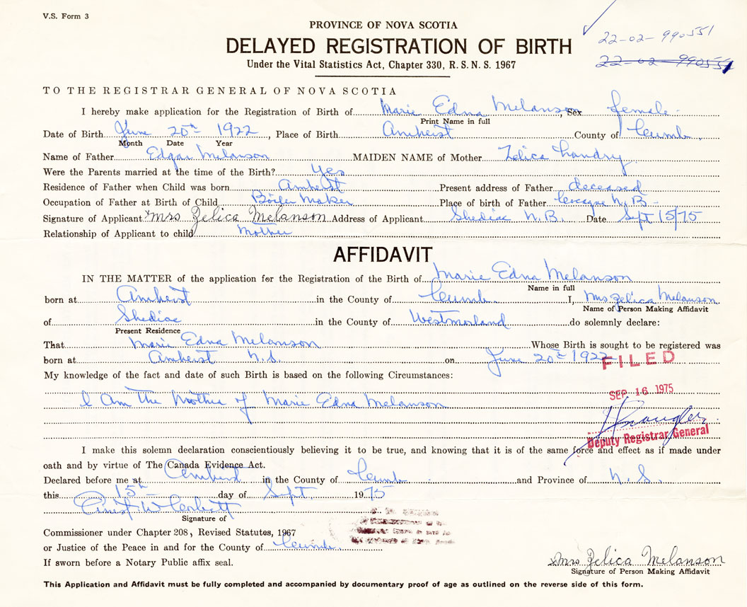 I hereby make application for the Registration of Birth of Marie EdnaMelanson Sex Female