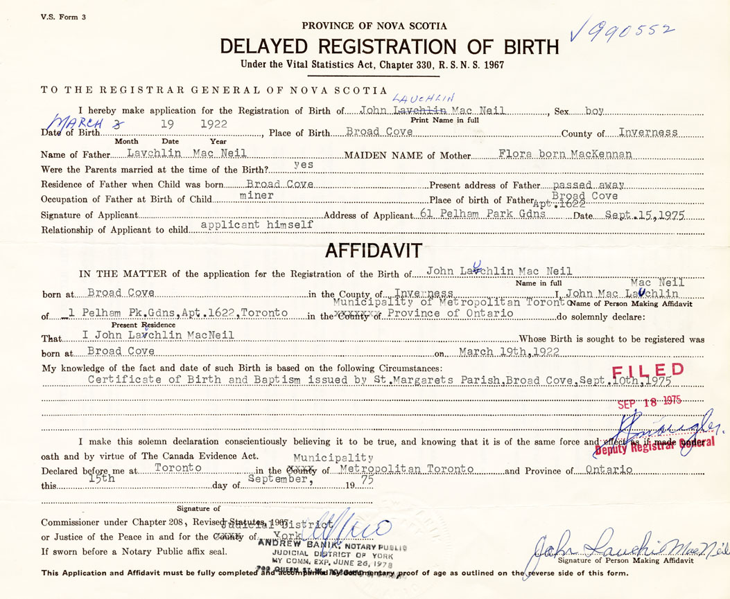 Date of Birth March 19, 1922 Place of Birth Broad CoveCounty of Inverness
