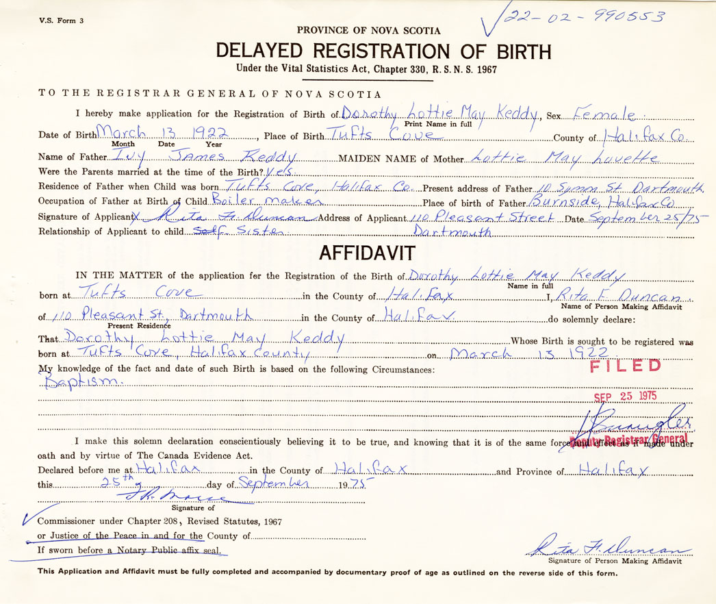 Date of Birth March 13, 1922 Place of Birth Tufts CoveCounty of Halifax