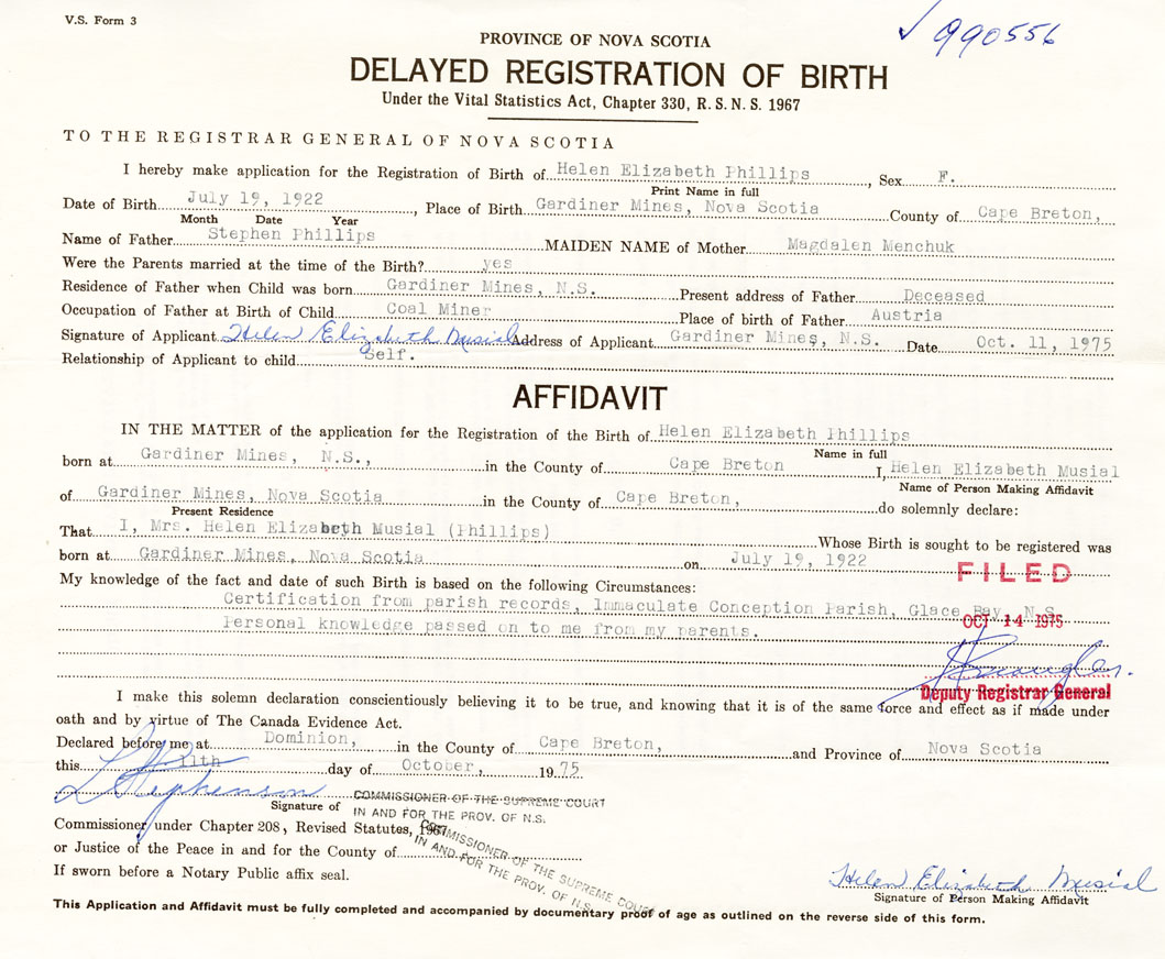 Signature of Applicant Helen Elizabeth Musial Address of Applicant Gardiner Mines, Cape Breton Date 11 October 1975