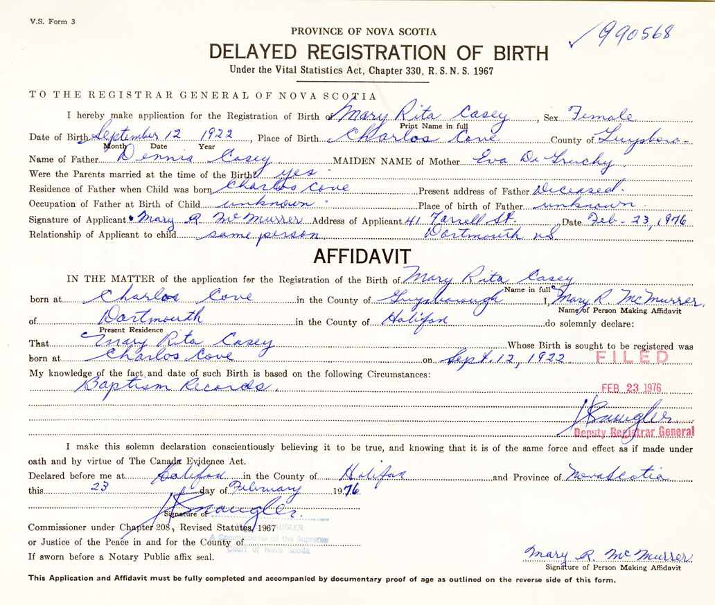 Date of Birth September 12, 1922 Place of Birth Charlos CoveCounty of Guysborough