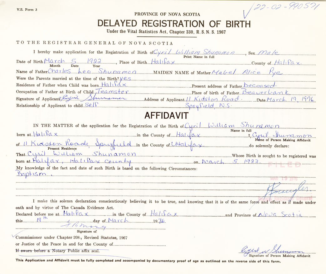 Signature of Applicant Cyril Shunamon Address of Applicant 11 Kidston Road, Spryfield, Halifax Date 19 March 1976