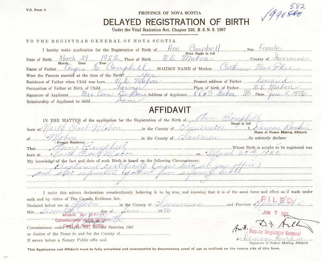 Date of Birth March 29, 1922 Place of Birth North East MabouCounty of Inverness