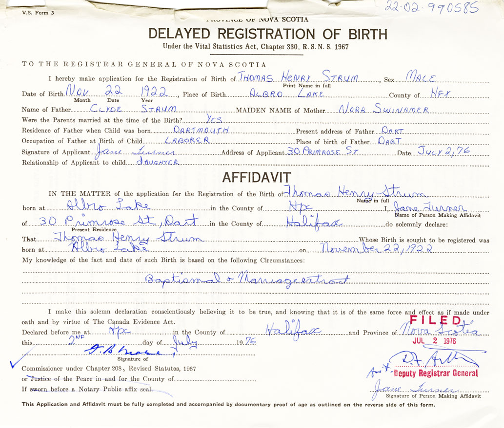 I hereby make application for the Registration of Birth of Thomas HenryStrum Sex Male