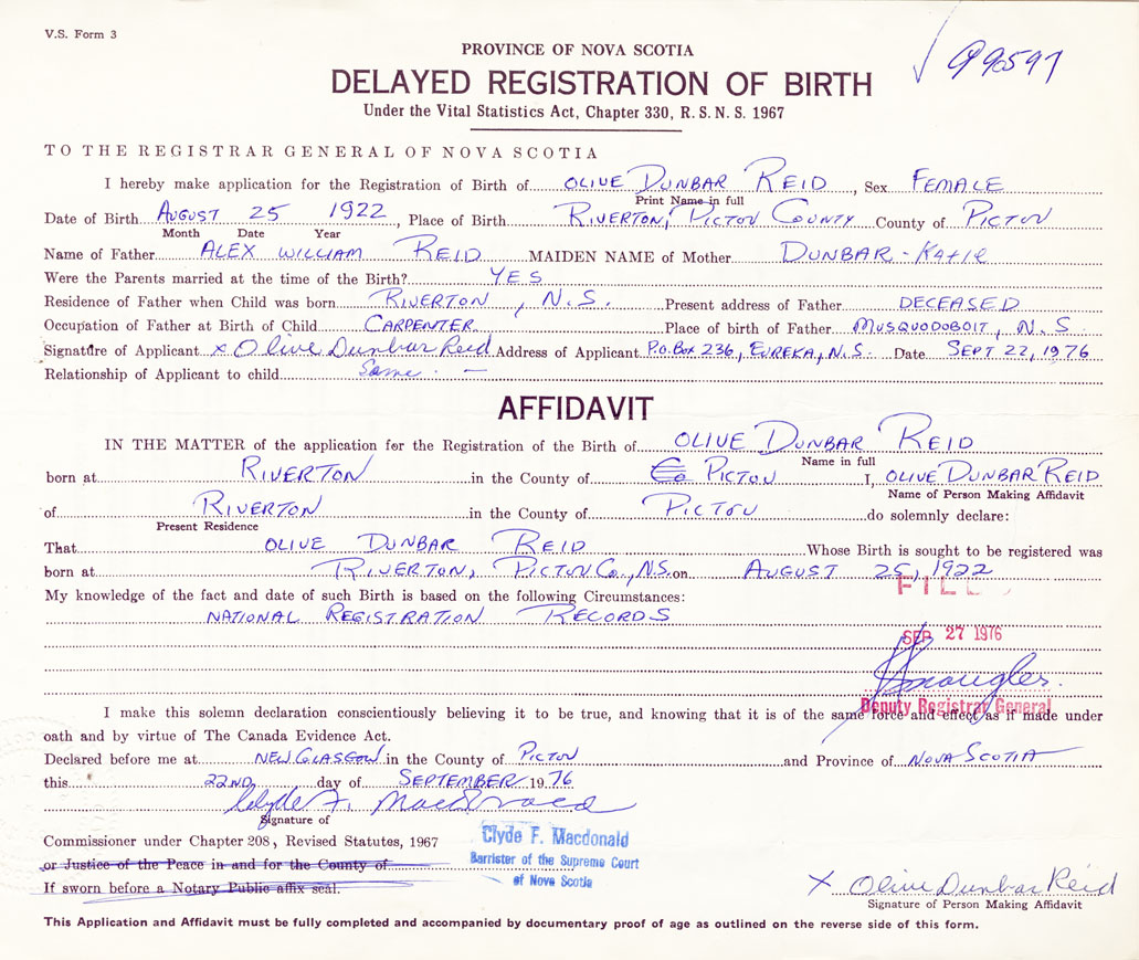 Signature of Applicant Olive Dunbar Reid Address of Applicant PO Box 236, Eureka, Pictou Date 22 September 1976