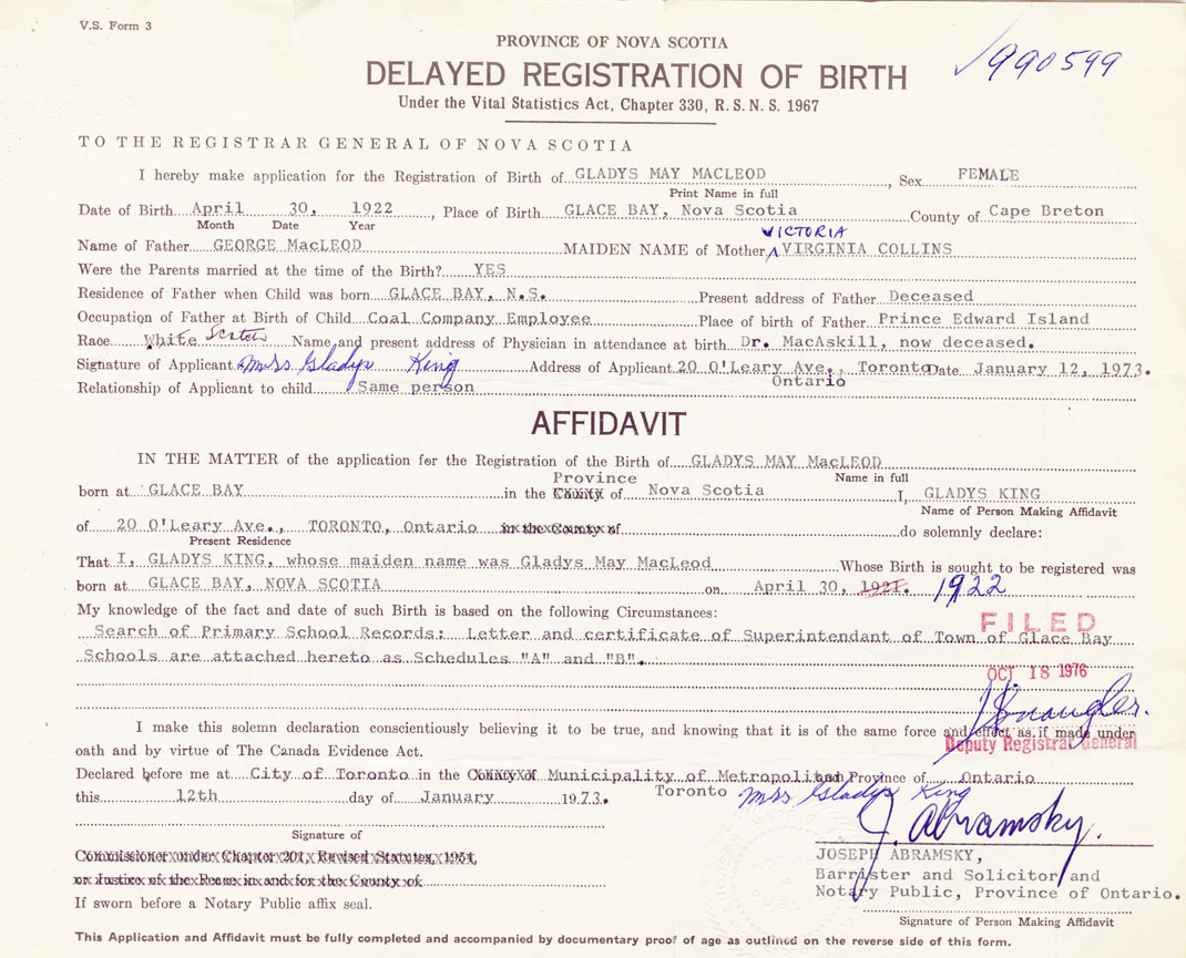 IN THE MATTER of the application for the Registration of the Birth of Gladys MayMacLeod