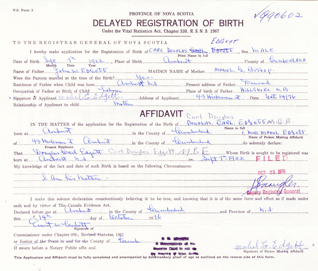 IN THE MATTER of the application for the Registration of the Birth of Carl DouglasEdgett