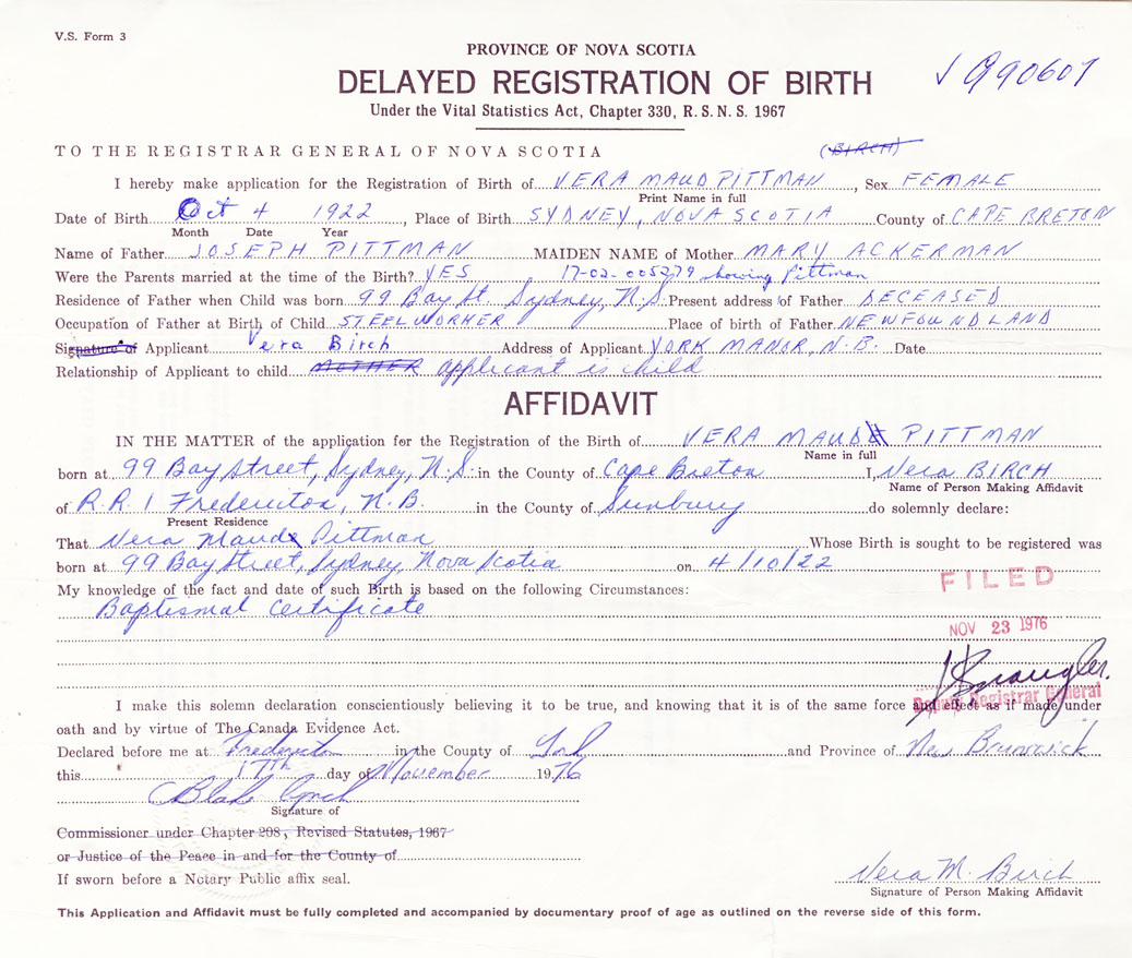 Signature of Applicant Vera Birch Address of Applicant York Manor, New Brunswick Date November 1976