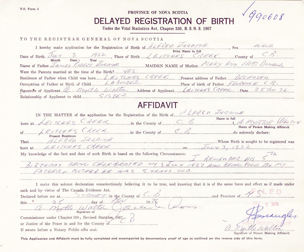 born at Leitches Creek Cape Breton County on July 3, 1922