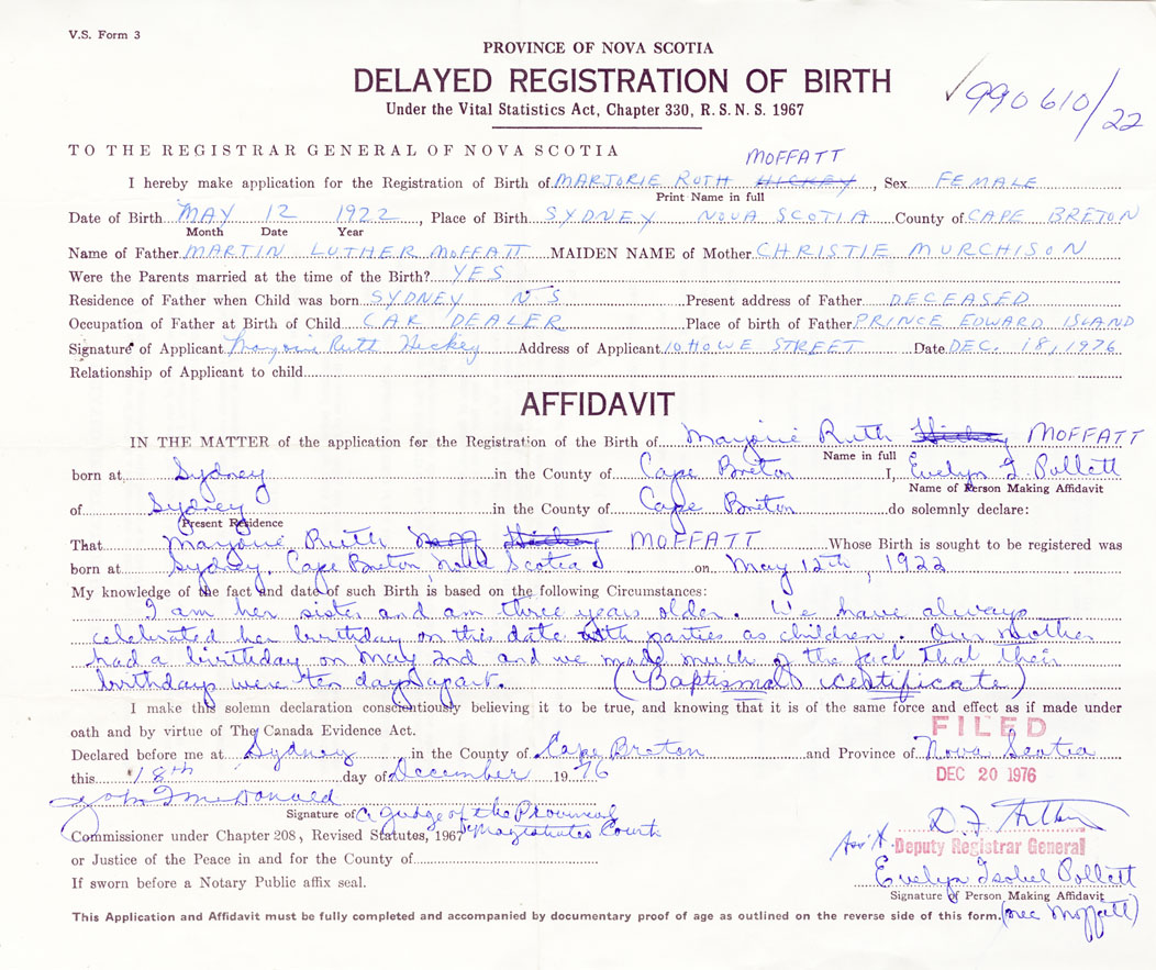 Signature of Applicant Marjorie Ruth Hickey Address of Applicant 10 Howe Street, Sydney, Cape Breton Date 18 December 1976